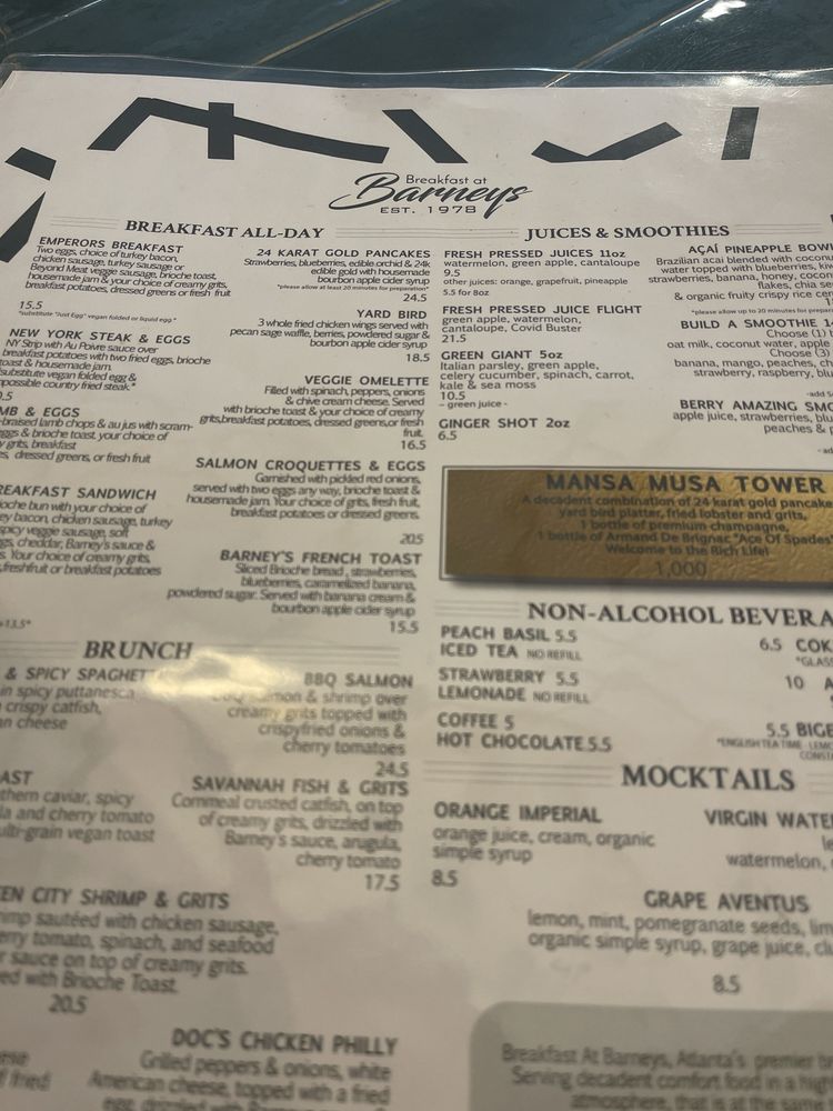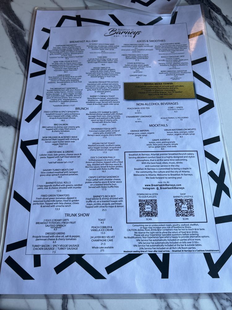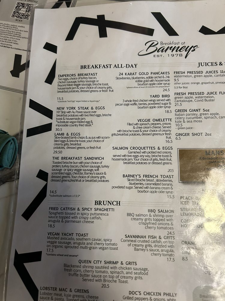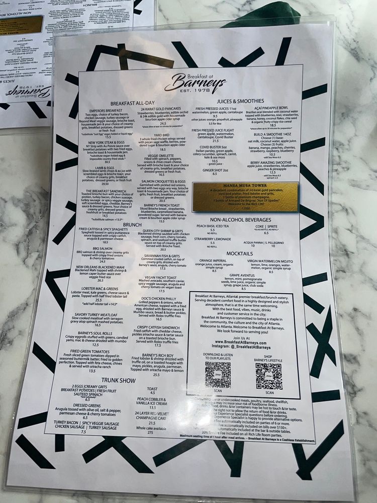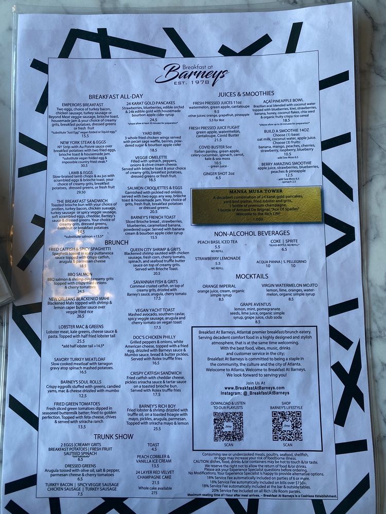 Introducing the menu at Breakfast At Barneys, a champagne bar offering a new American twist on breakfast and brunch. Located in Atlanta, GA, this trendy spot provides vegan and vegetarian options, outdoor seating, and a full bar. The menu offers a southern favorite, catfish over spaghetti, with a sophisticated flair. Customers praise the plush emerald green velvet décor and the friendly staff who provide excellent recommendations. The private dining room is a highlight for group events, making it a popular choice for private brunches. Despite the slightly higher prices, patrons find the quality of the dishes justifies the cost. With a charming floral display outside and a text notification system for table availability, Breakfast At Barneys promises a memorable dining experience.