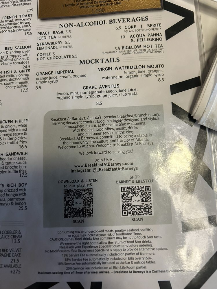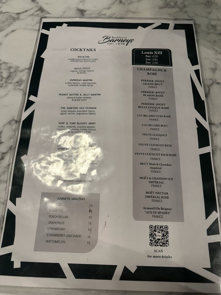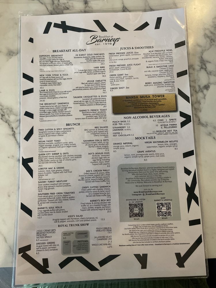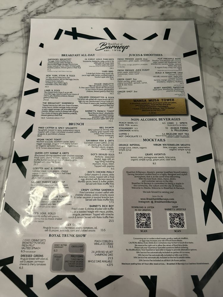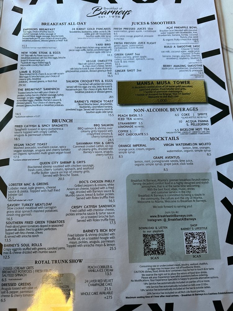 Introducing the menu at Breakfast At Barneys, a champagne bar offering a new American twist on breakfast and brunch. Located in Atlanta, GA, this trendy spot provides vegan and vegetarian options, outdoor seating, and a full bar. The menu offers a southern favorite, catfish over spaghetti, with a sophisticated flair. Customers praise the plush emerald green velvet décor and the friendly staff who provide excellent recommendations. The private dining room is a highlight for group events, making it a popular choice for private brunches. Despite the slightly higher prices, patrons find the quality of the dishes justifies the cost. With a charming floral display outside and a text notification system for table availability, Breakfast At Barneys promises a memorable dining experience.